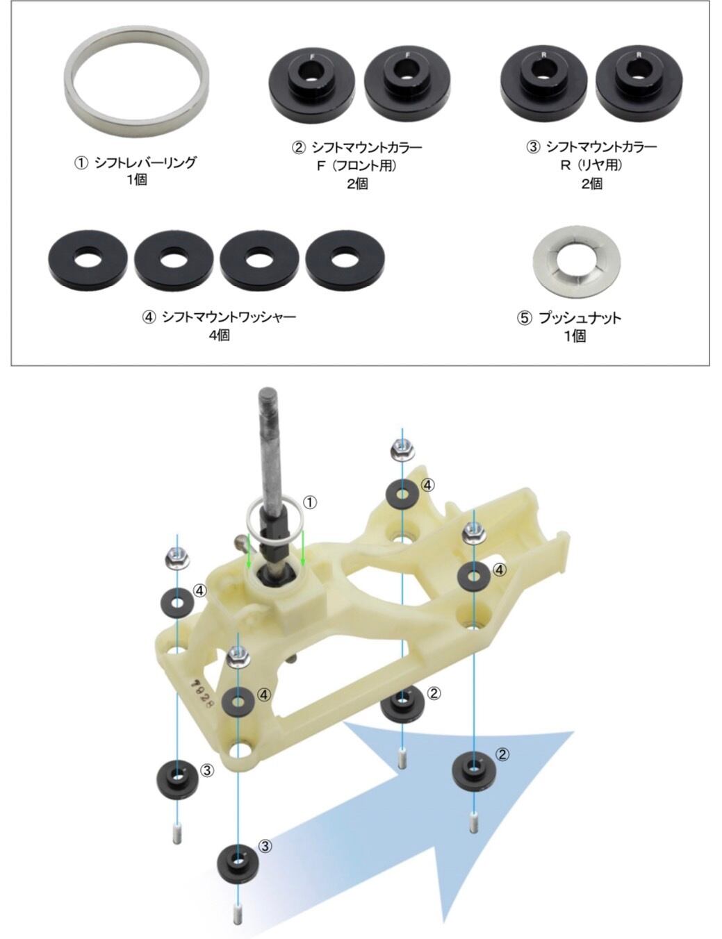 シフトディバイスを固定する4箇所のゴムブッシュとシフトレバーのゴムリングを金属製へ変更するセットです。